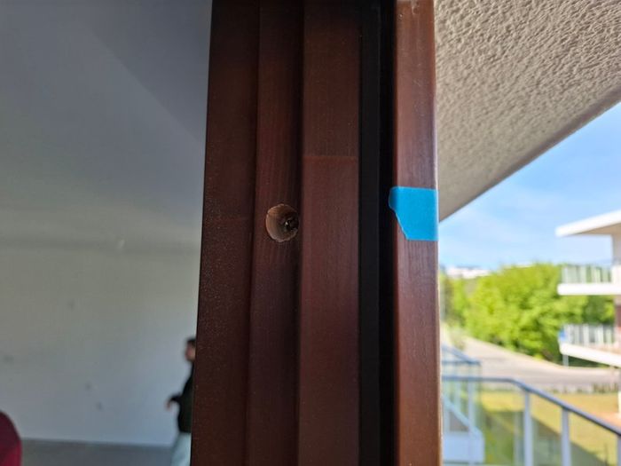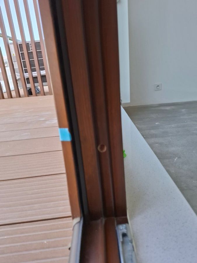 “Holl: zawyżenie posadzki, drzwi zewnętrzne- ubytek uszczelki. Pokój nr 2: rama- rysy wewnętrzne i zewnętrzne, ubytek na uszczelce okiennej. Pokój nr 3: rama- rysy/ubytki wewnętrzne i zewnętrzne. Salon: szyby- rysy, tynki- pęknięcia, rama- ubytki/rysy wewnętrzne i zewnętrzne. Balkon: do poprawy uszczelnienie glifu zewnętrznego”